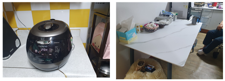 물에도 강한 세라믹 식탁을 고르시고, 혼자서도 식사를 해결할 수 있도록 보온이 잘 되는 전기밥솥을 사셨습니다.