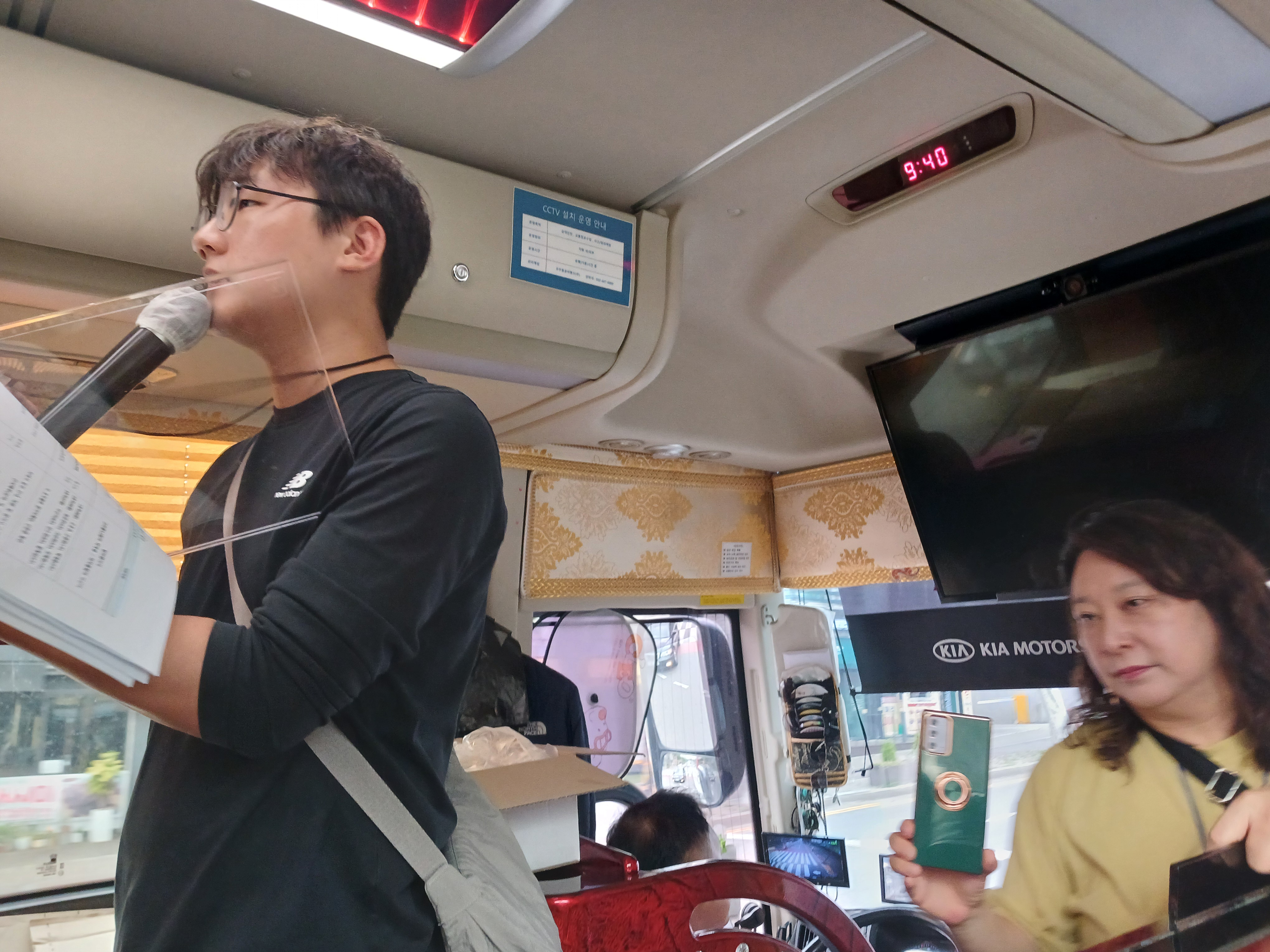 분주한 손길 속에서 버스 안은 어느새 웃음소리로 가득 찼고, 자연스럽게 자기소개 시간이 이어졌습니다. 처음엔 조금 어색했지만, 이내 분위기는 부드럽고 따뜻해졌습니다.