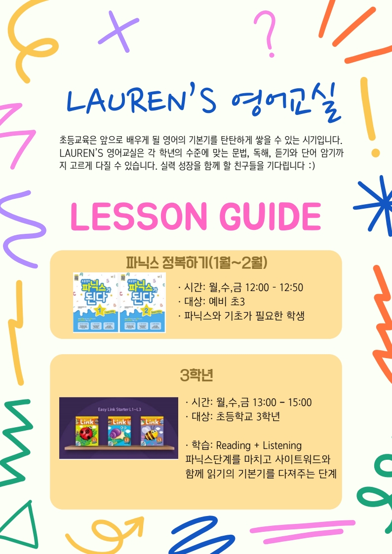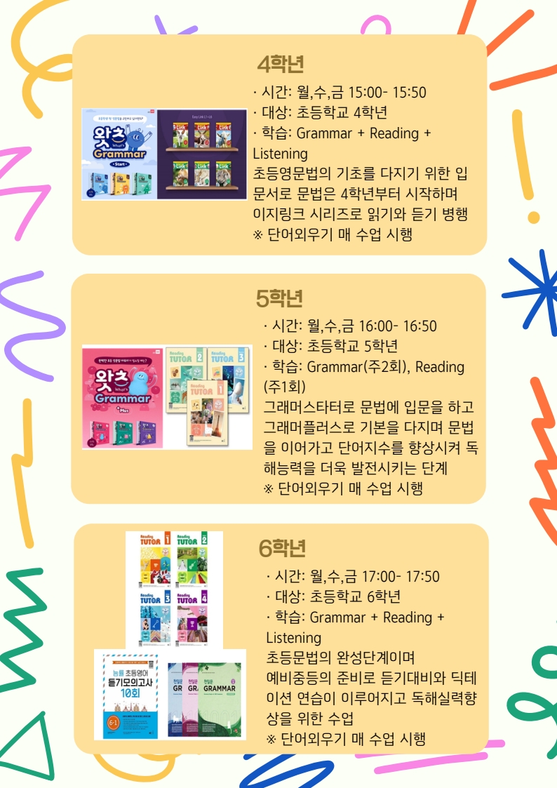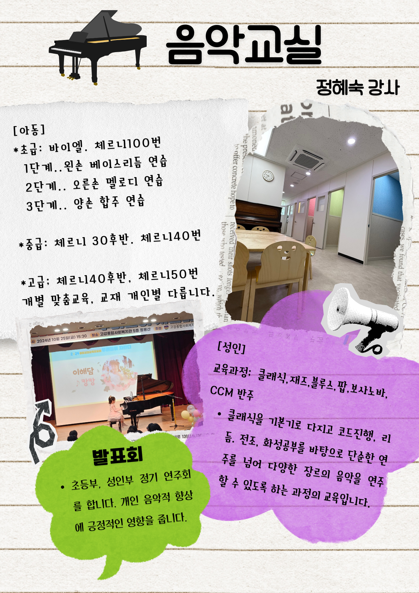 음악교실(피아노), 미술교실, 영어교실, 유레카교실(학습)
