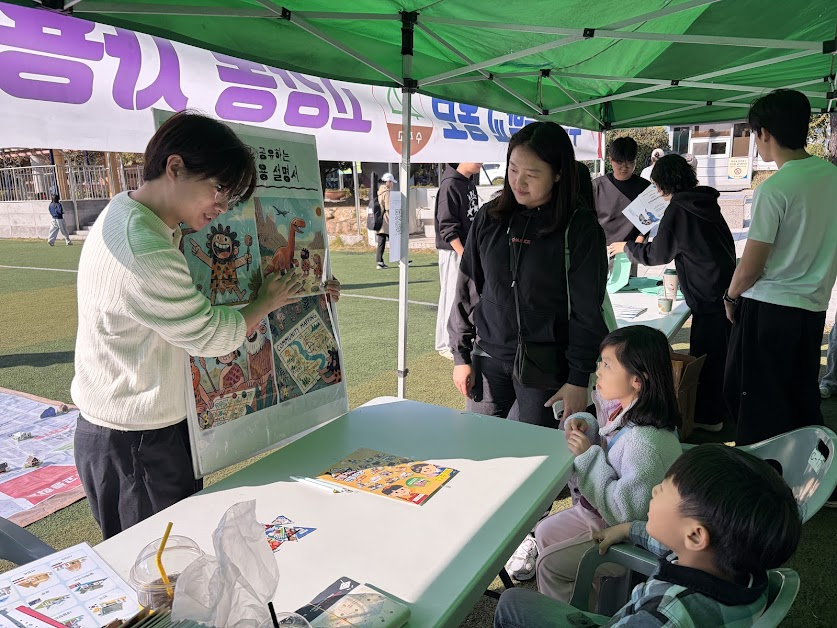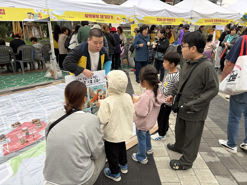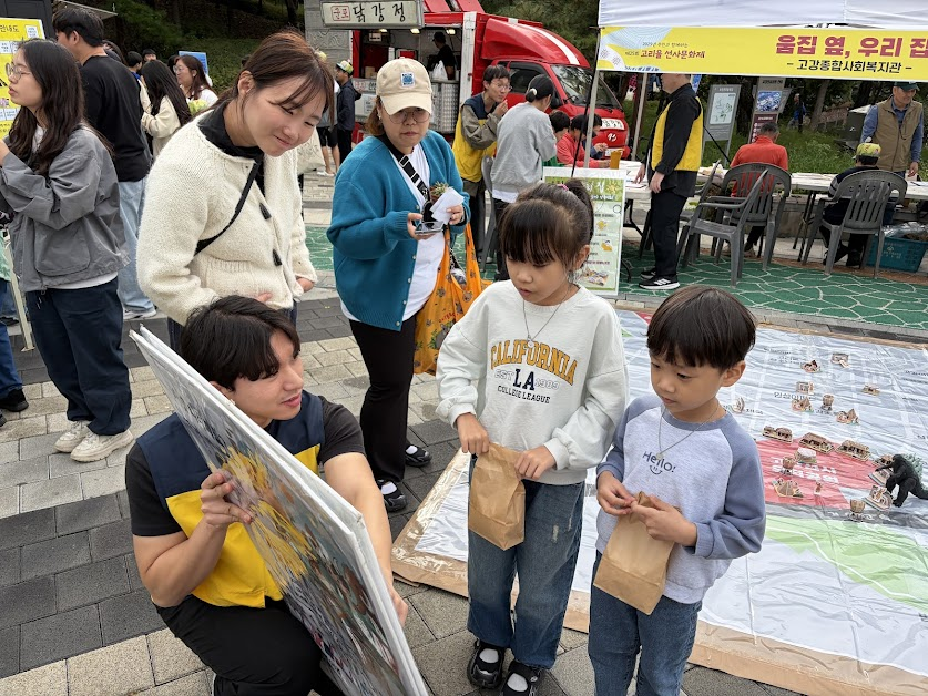 부스에서는 큰 마을 지도를 앞에 두고, 참가자들이 자신이 살거나 좋아하는 장소에 직접 만든 모형을 배치하도록 진행했습니다. 부모와 아이가 함께 참여하며 자연스럽게 마을 이야기를 나누는 모습이 특히 인상적이었습니다.
