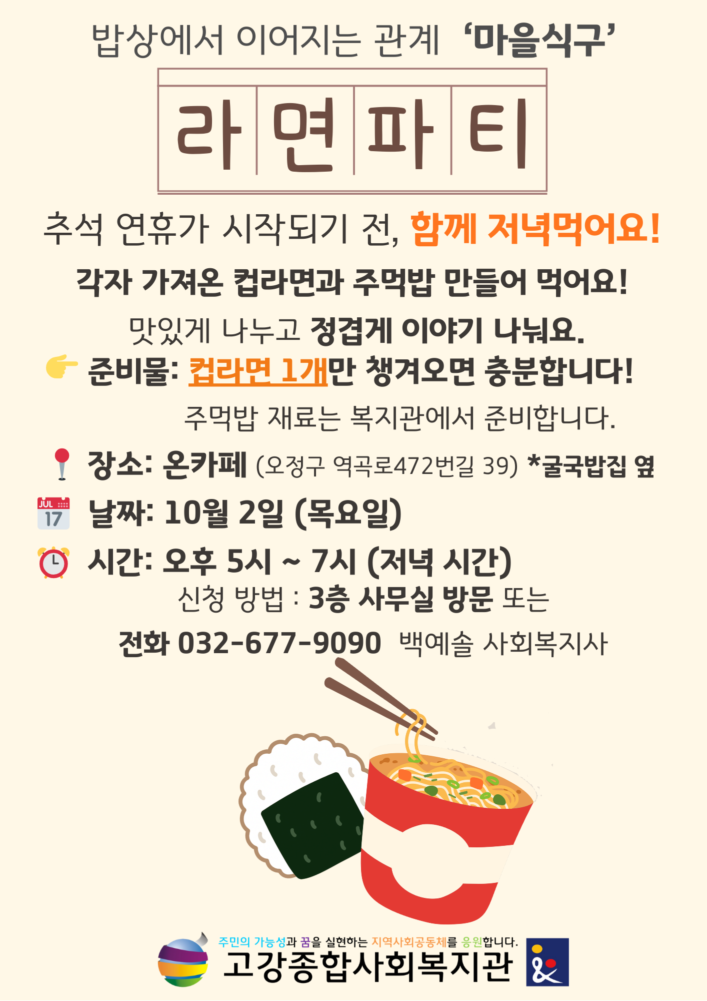 마을에서는 라면 파티가 진행되었습니다. 이번 라면 파티는 고강종합사회복지관의 마을 사업 중 ‘밥상에서 이어지는 관계-마을 식구’에서 기획하여 마련된 자리였습니다.