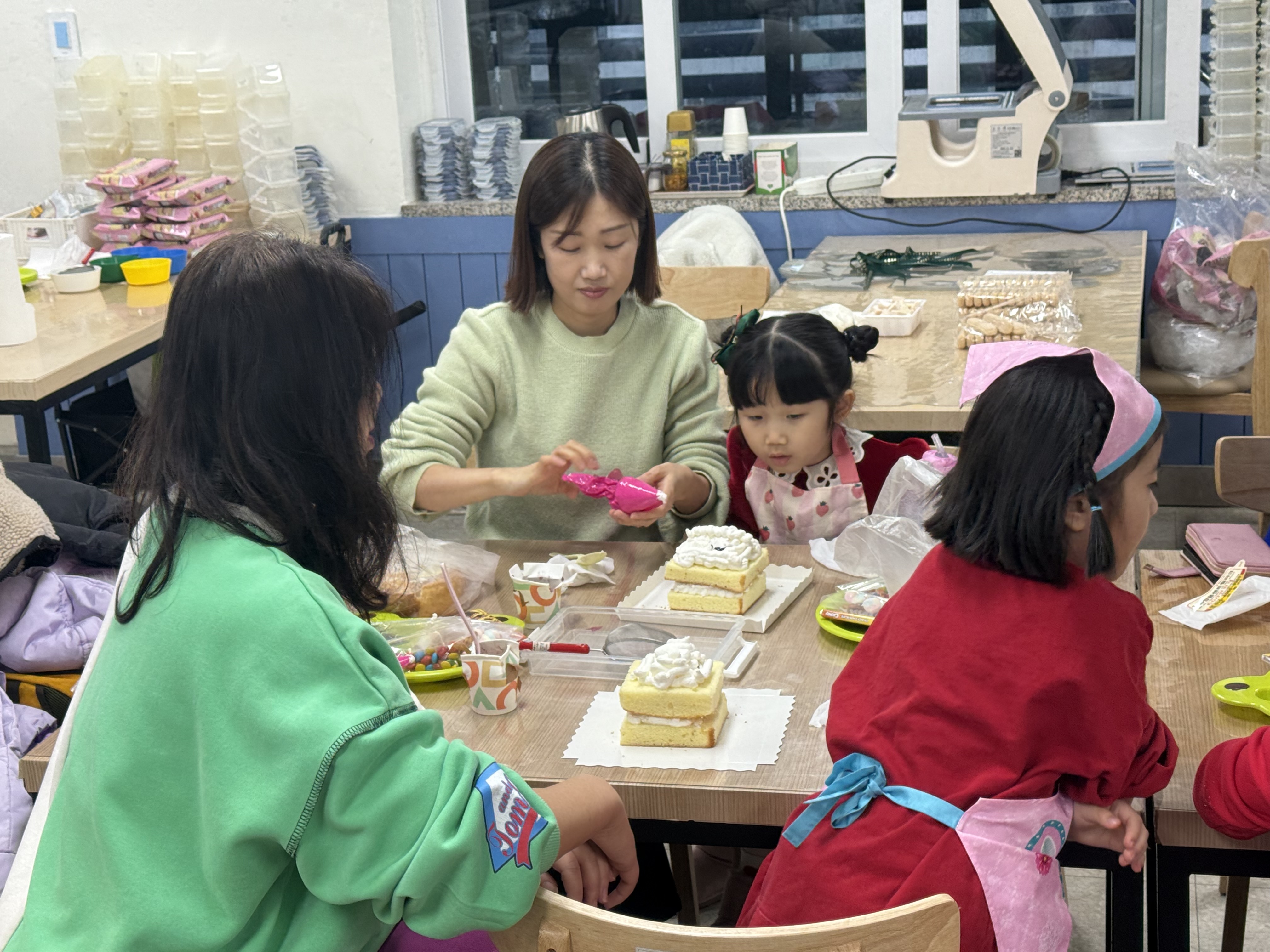 두 번째 시간에는 더욱 특별한 크리스마스 과자집 케이크 만들기에 도전했어요! 🍰 보호자와 아이들이 삼삼오오 모여 집중하는 모습은 그 어떤 예술 작품보다 아름다웠답니다. 과자와 생크림으로 뚝딱뚝딱! 멋진 크리스마스 하우스를 완성하는 아이들의 얼굴에는 뿌듯함과 행복이 가득했어요.