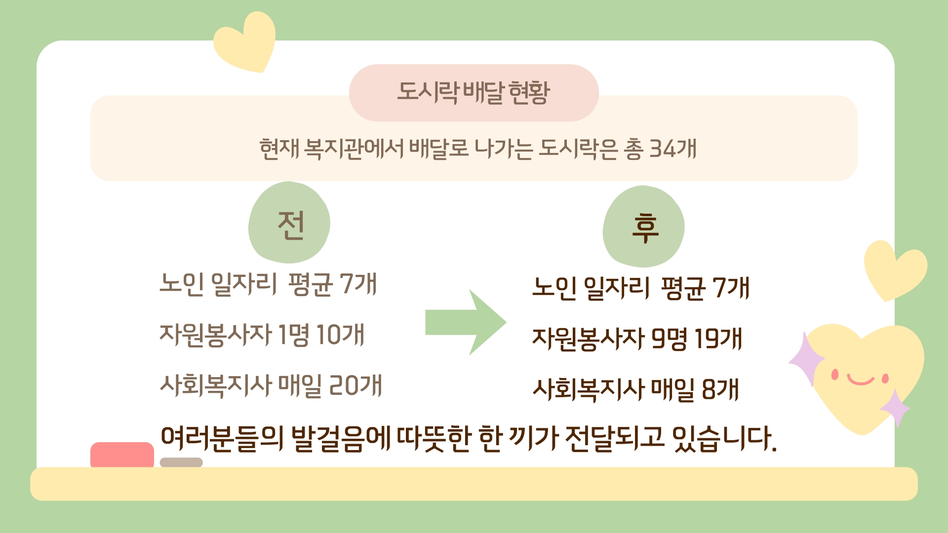 그 결과 자원봉사자 9명이 19개를, 사회복지사는 매일 8개를 배달하게 되는 큰 성과를 이룰 수 있었습니다.